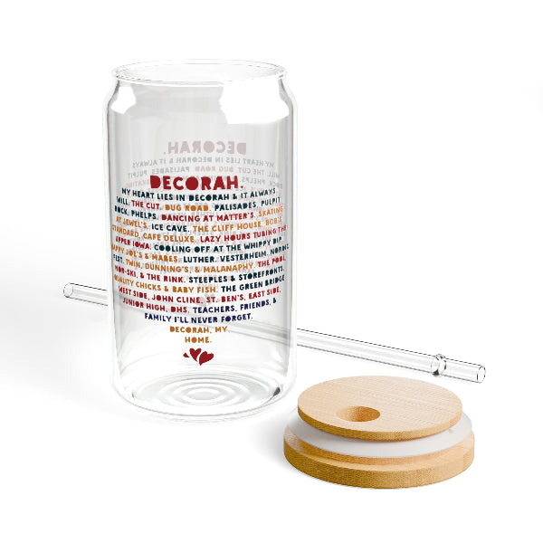 Quench your thirst in style with our 16oz Sipper Glass featuring the "My Heart Lies in Decorah" poem-graphic. Made from clear tempered glass, it's durable, sleek, and perfect for refreshing cocktails, juices, or any beverage you fancy. This sipper glass is FDA Certified, BPA Free, and Cal. Prop 65 compliant, ensuring your safety and peace of mind with every sip. Hand wash only.