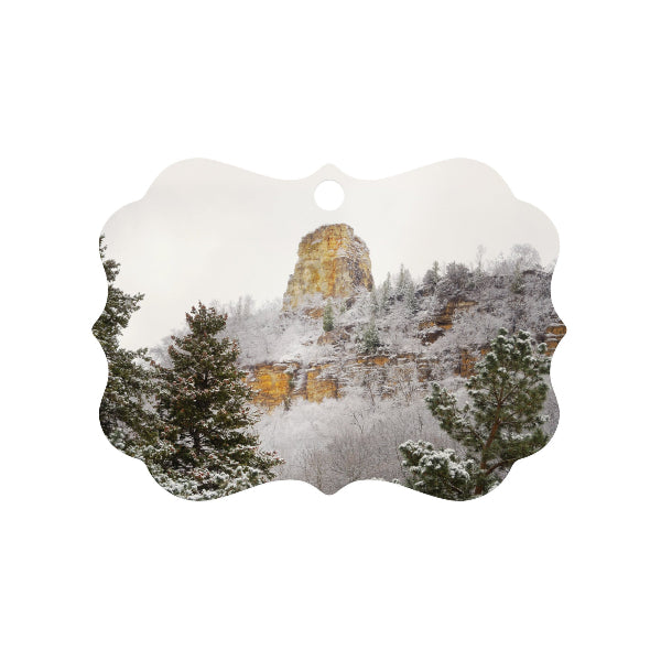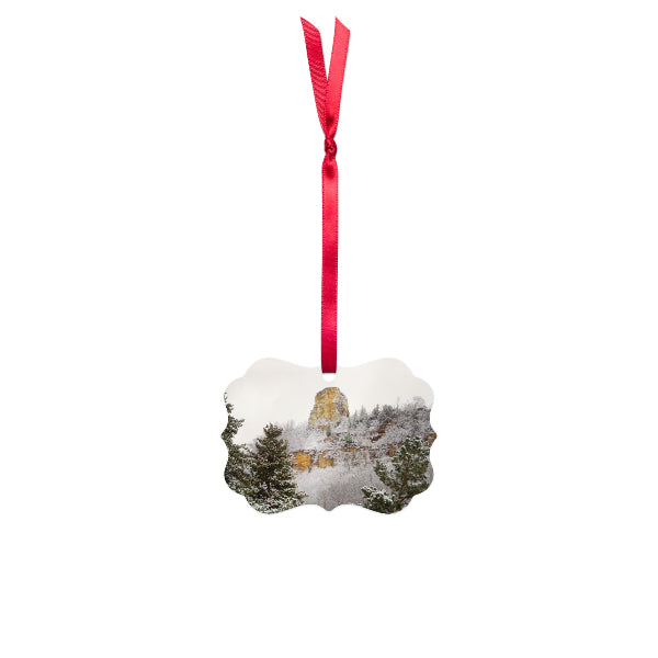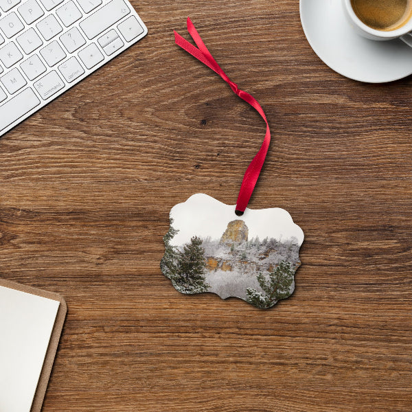 Celebrate Winona, Minnesota with this high-quality aluminum ornament featuring Sugarloaf beautifully framed through frosty winter trees. Each piece is crafted on durable 1 mm–thick metal. 3" by 4" size. Comes ready to hang with a red ribbon.