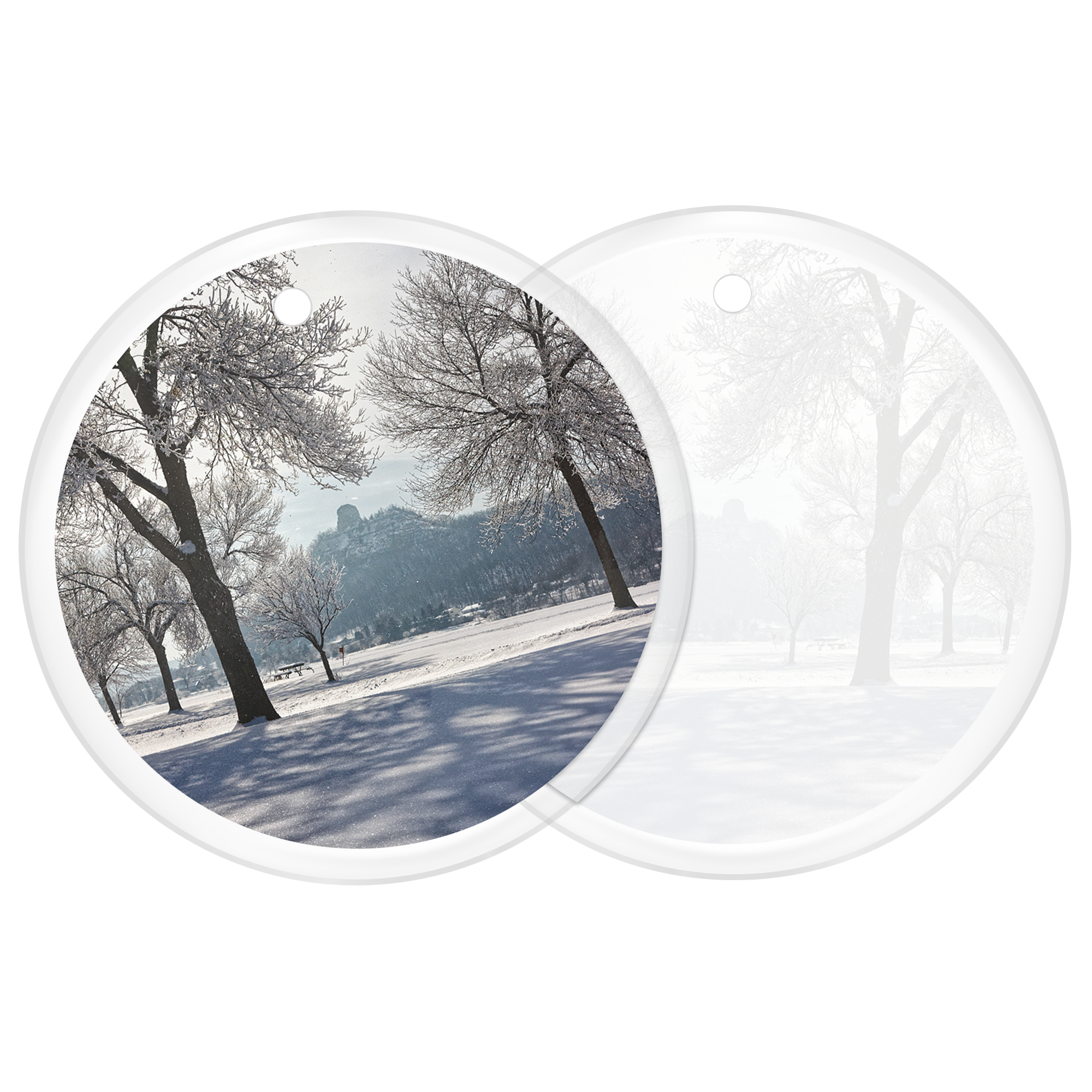 Add a modern, elegant touch to your holiday décor with this lightweight glass ornament featuring a photo of Sugarloaf framed by frosty winter trees in Winona, Minnesota. Each 3" x 3" ornament includes a red satin ribbon for easy hanging and displays the image beautifully on one side.