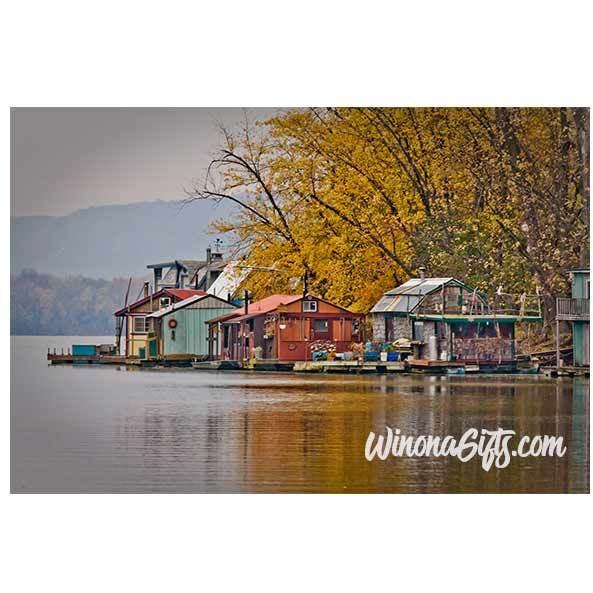 Autumn At Latsch Island Boathouses In Winona Minnesota art print features the Latsch Island boathouse community on the Mississippi River in Winona.