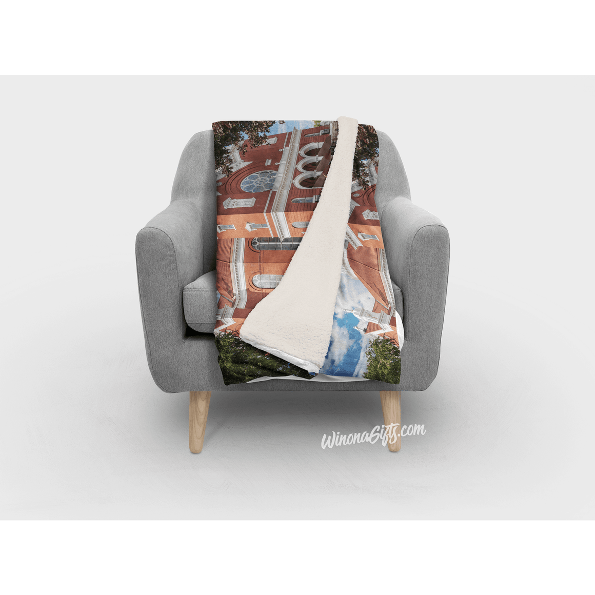 Cuddle up with this classic Winona scene featuring the Minor Basilica of Saint Stanislaus Kostka. Image is printed on a soft, smooth side of the blanket; the other side is soft and warm sherpa.