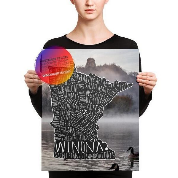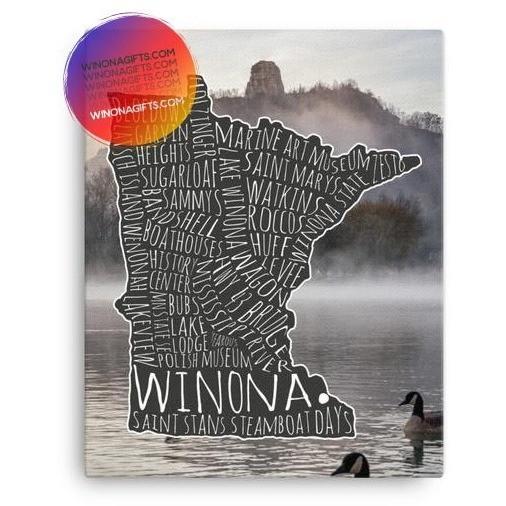 Canvas Wrap Winona Typography Map With Sugarloaf Geese, 16x20, Heavy Traffic