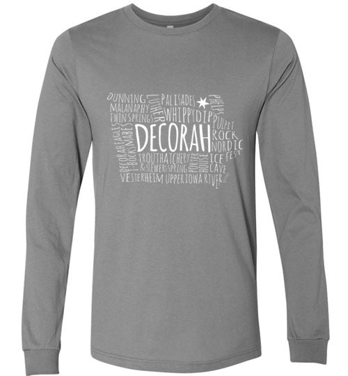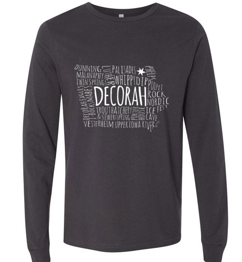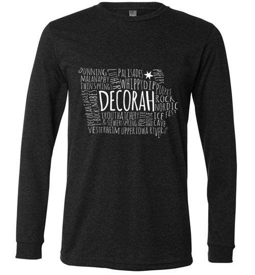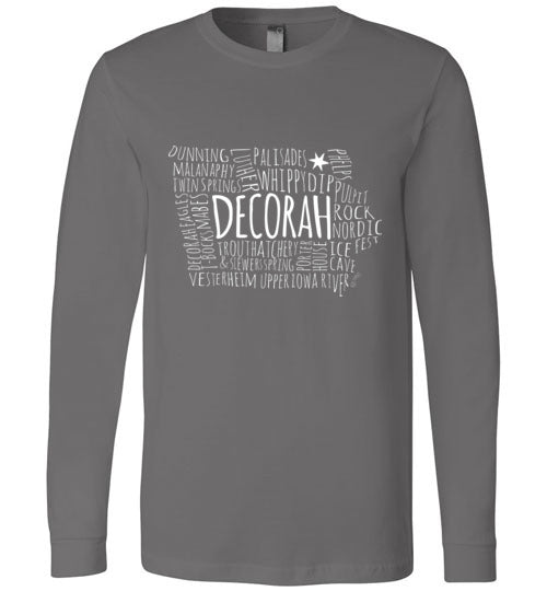 Stylish, slightly fitted long-sleeve t-shirt features a playful take on points of interest in Decorah, Iowa.