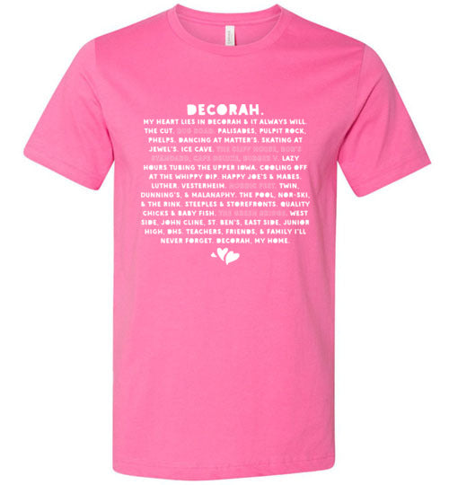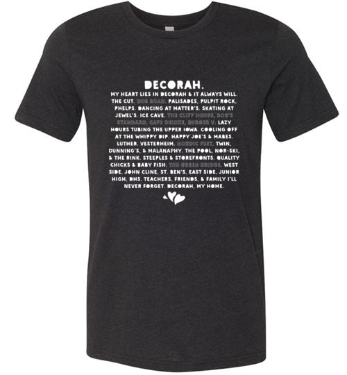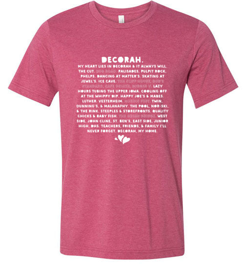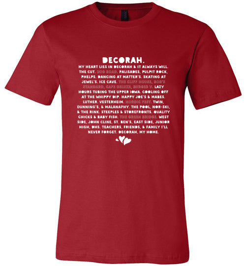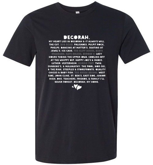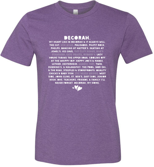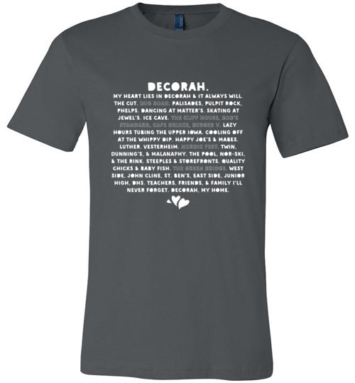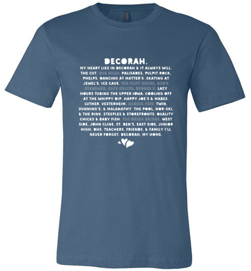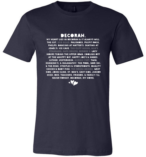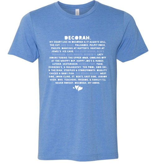 "My heart lies in Decorah and it always will ..." begins the heartwarming poem on this quality t-shirt. This is the perfect gift for anyone who loves Decorah, Iowa.