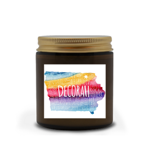 This adorable candle, featuring an Iowa map with favorite Decorah landmarks, will cast a cozy glow in the scent of your choice.