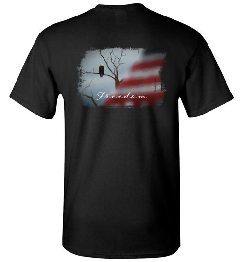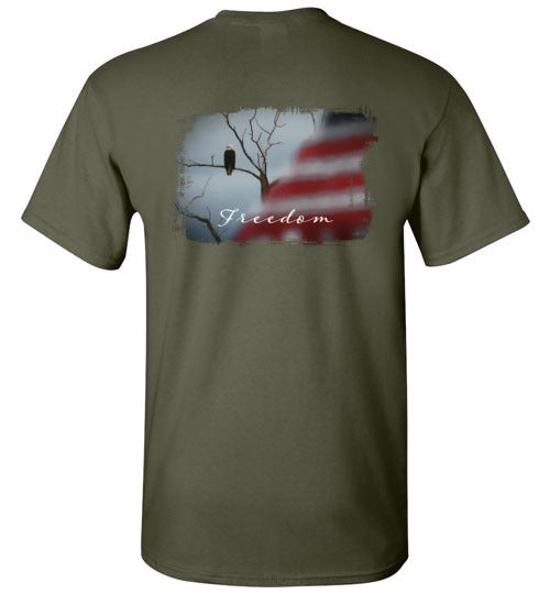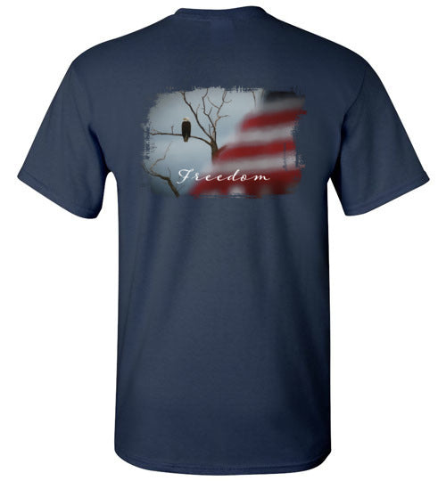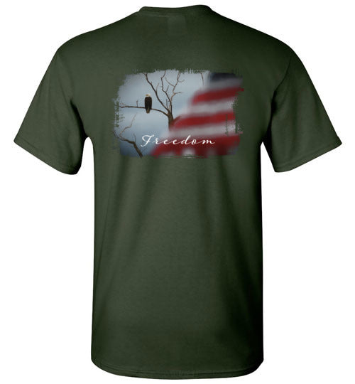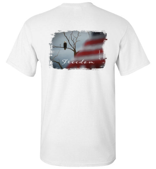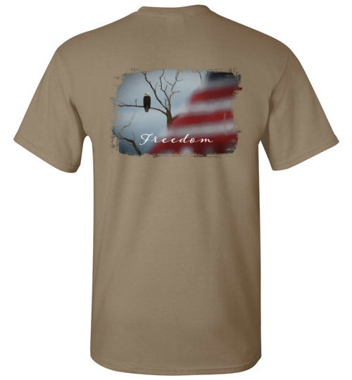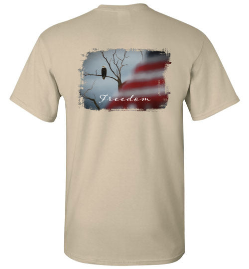 Embrace your American spirit with this affordable and comfortable tee. Made from 5.3 oz 100% preshrunk cotton, this Gildan tee features a vivid patriotic scene with an eagle and American flag. Standard fit. Design is printed on rear of shirt.