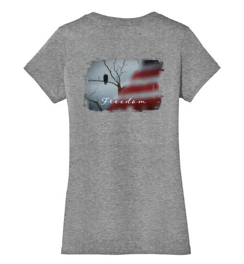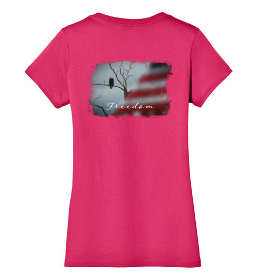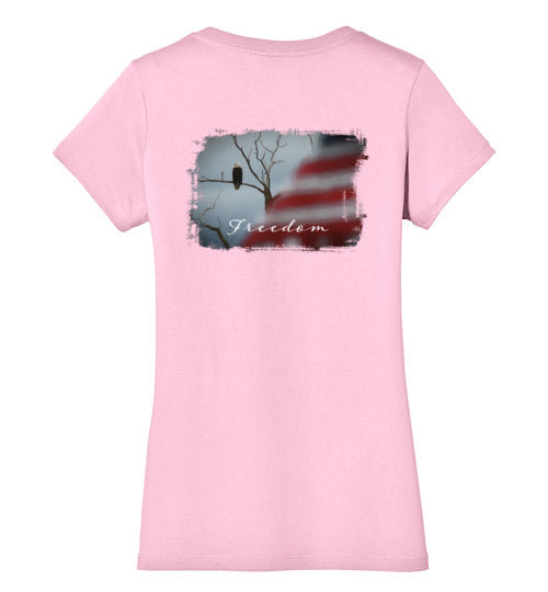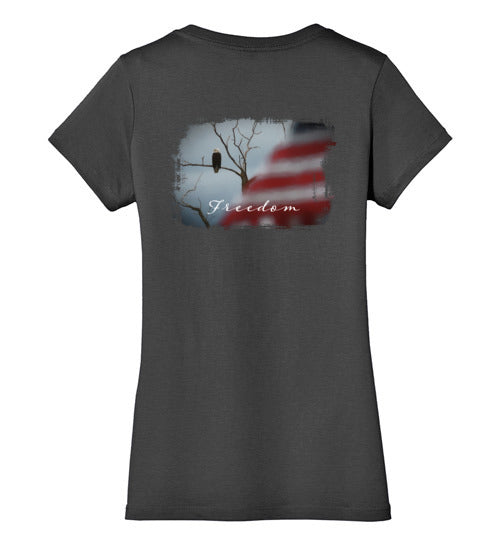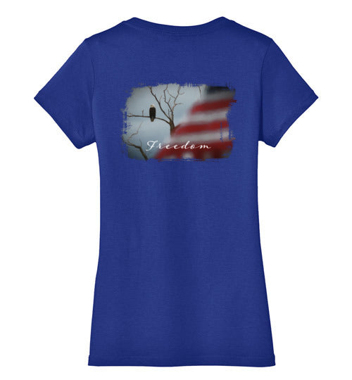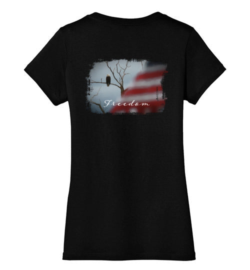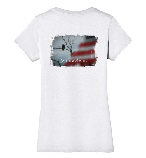 Embrace your American spirit with this feminine, comfortable tee. Made from 4.3 oz 100% preshrunk cotton, it features a vivid patriotic scene with an eagle and American flag. 100% ring-spun combed cotton. Shirt has a feminine fit that is fitted but not skin-tight. Design is on rear of shirt.