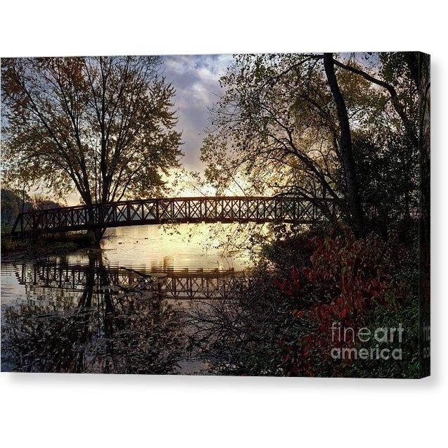 Winona, Minnesota, scene featuring the footbridge at West Lake Winona in Winona, Minnesota. Canvas print is stretched on 1.5" x 1.5" stretcher bars, ready to hang with pre-attached hanging wire, mounting hooks, and nails.