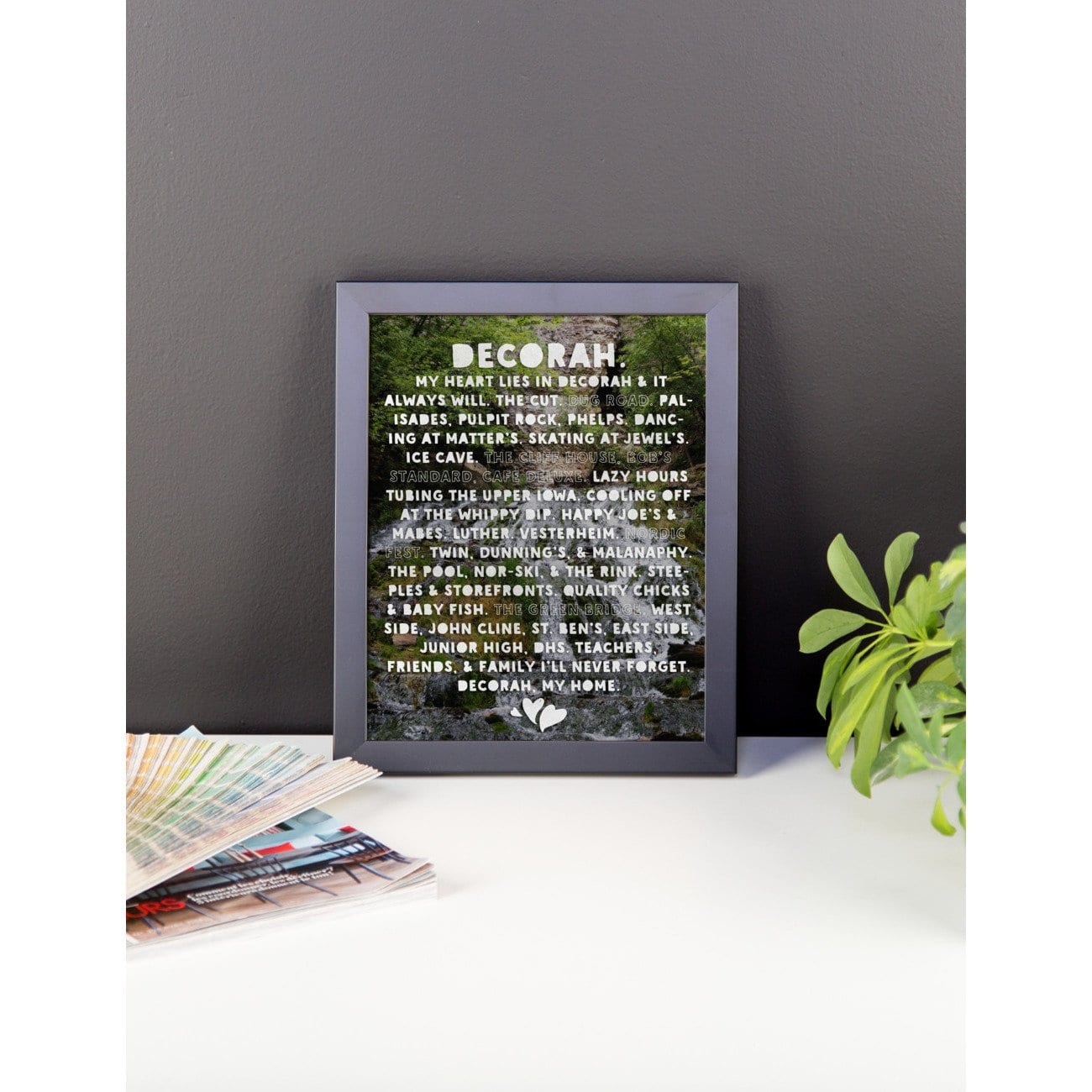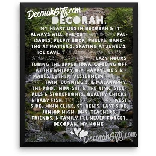A framed, enhanced matte poster featuring Dunning Springs in Decorah, Iowa, with "My Heart Lies In Decorah" design. Black frame is alder, semi-hardwood.