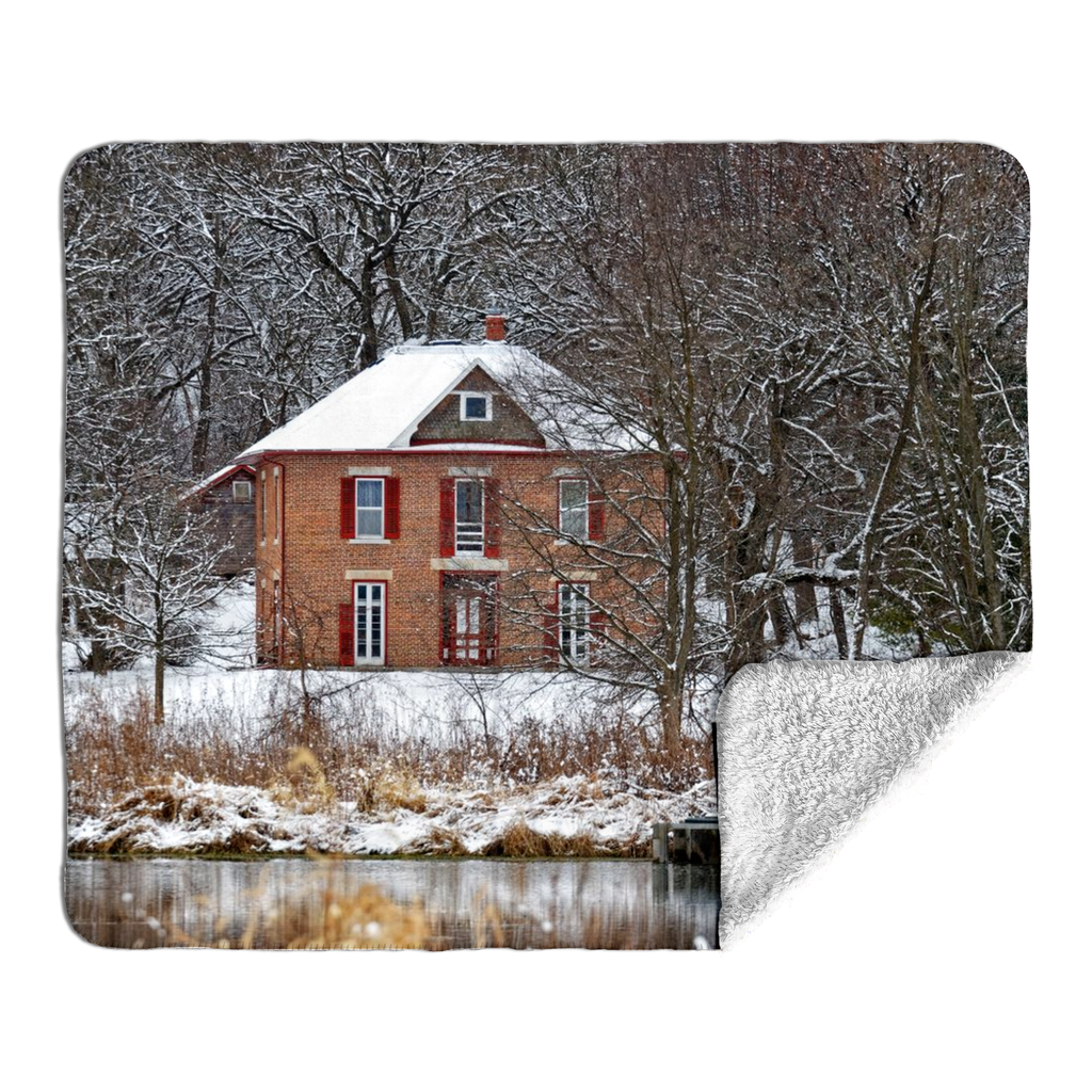 Cuddle up with this classic Decorah scene featuring the beloved Hjelle House in Decorah, Iowa. Image is printed on a soft, smooth side of the blanket; the other side is soft and warm sherpa.