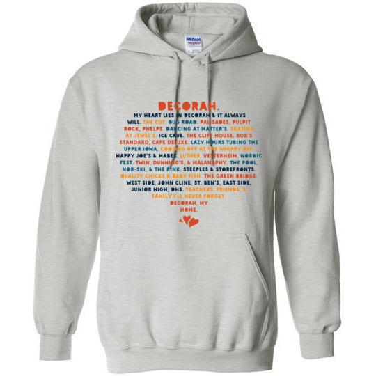 Declare your love for Decorah IA with a Decorah sweatshirt. This Decorah IA hoodie sweatshirt declares your love for your Decorah memories including The Cut, Dug Road, Palisades & More in bold bright colors.