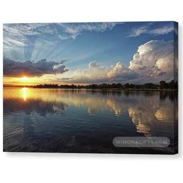 This summer sunset at East Lake Winona in Winona Minnesota, photograph is printed onto a premium canvas and then stretched on a wooden frame of 1.5" x 1.5" stretcher bars. Your canvas print will be delivered to you "ready to hang" with pre-attached hanging wire, mounting hooks, and nails.