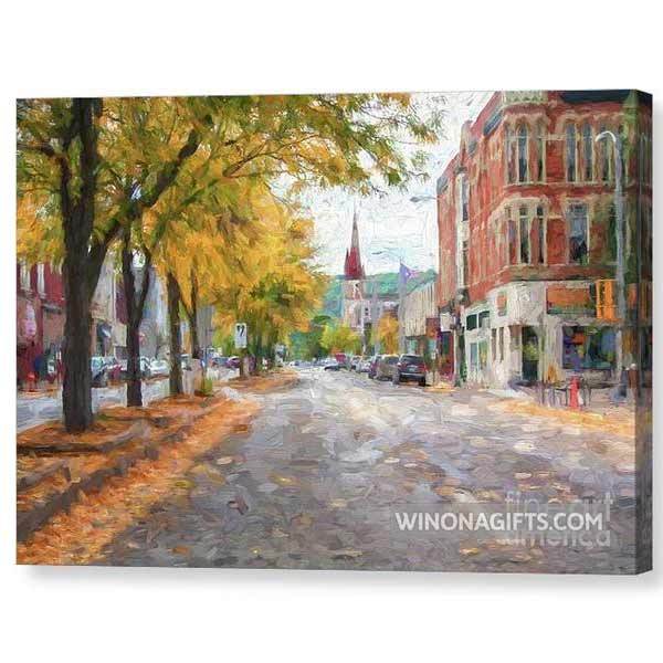 Iconic Winona, Minnesota, scene featuring Main Street in the fall. Image is a digital painting based on photograph. Canvas print is stretched on 1.5" x 1.5" stretcher bars, ready to hang with pre-attached hanging wire, mounting hooks, and nails.