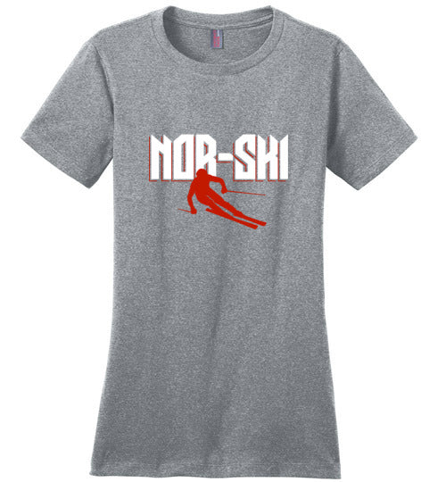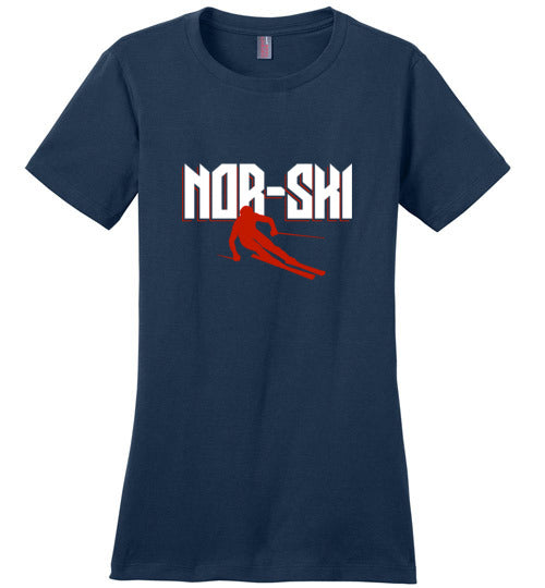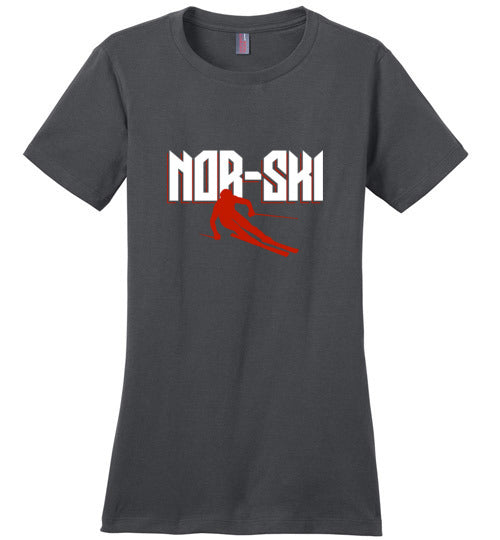 In honor of the fond memories that many have of skiing at Nor-Ski Runs in Decorah, Iowa, this ladies t-shirt will garner a nod and a smile from those who know.