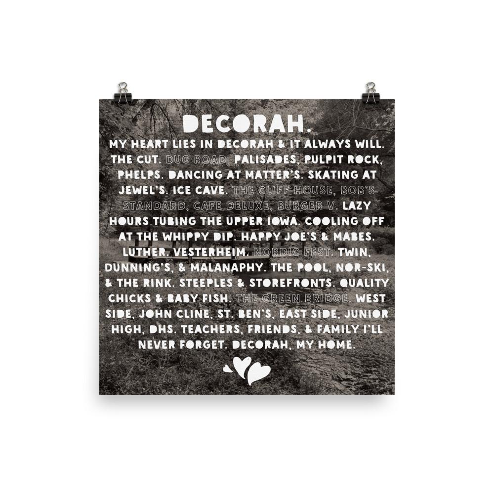 A Decorah poster perfect for anyone who grew up in Decorah, Iowa. Note that this version includes "Burger V." Black and white scene behind text is Twin Springs.
