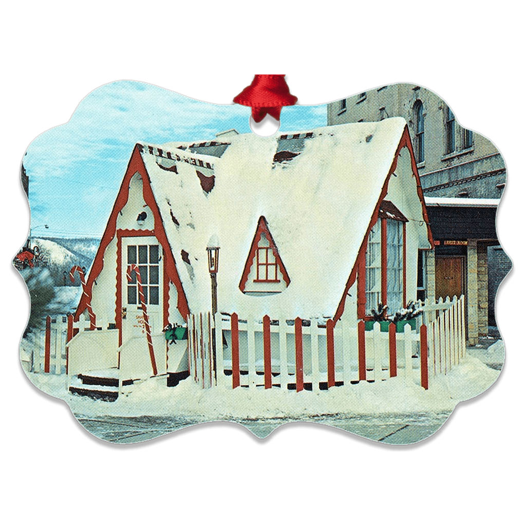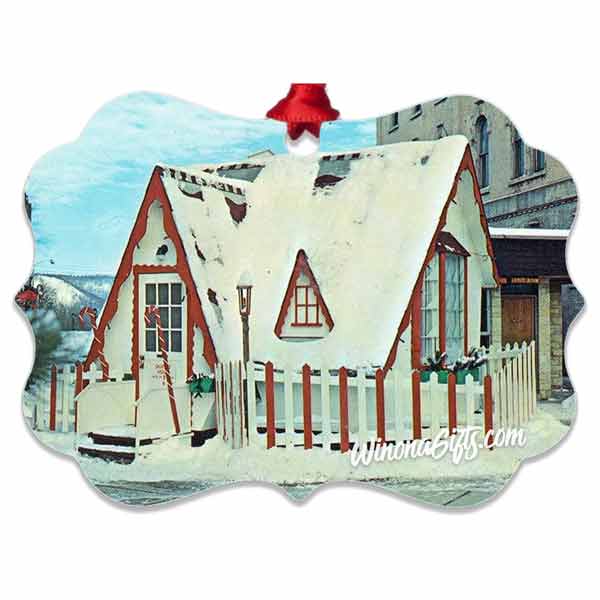 Smooth aluminum ornament is double-sided and features the beloved Santa House of Winona, Minnesota. Dimensions are approximately 4" x 3". Wipe clean with non-abrasive cleaning pad and mild soap or surface cleaner as needed. Hanging ribbon included.