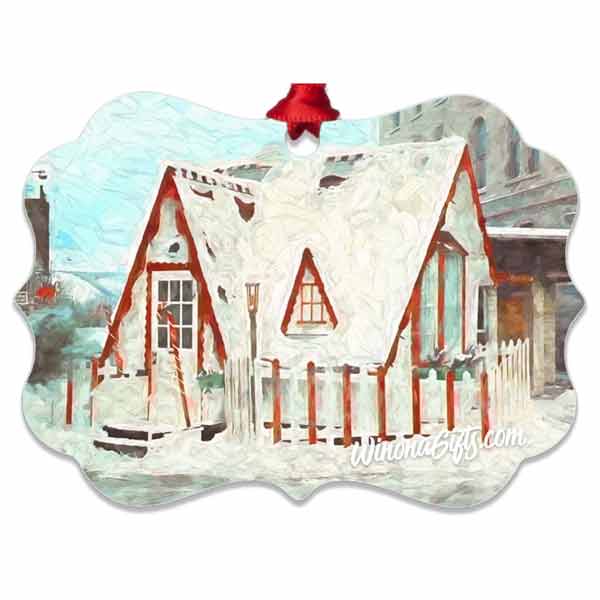 Smooth aluminum ornament is double-sided and features the beloved Santa House of Winona, Minnesota, as a digital painting. Dimensions are approximately 4" x 3". Wipe clean with non-abrasive cleaning pad and mild soap or surface cleaner as needed. Hanging ribbon included.