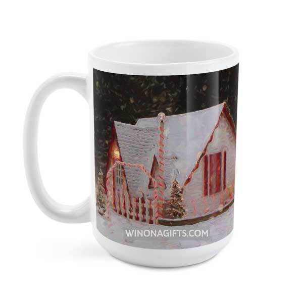 Dishwasher and microwave safe 15 oz coffee mug featuring the beloved Santa House in Winona, Minnesota. Image is a digital painting based on photograph.