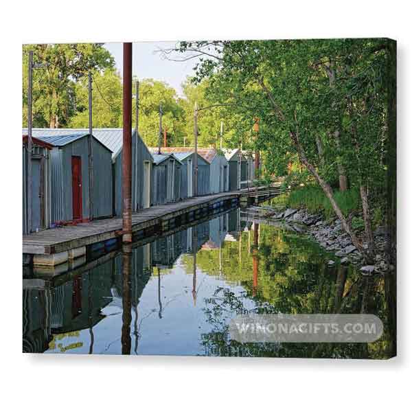 Iconic Winona, Minnesota, scene featuring the Winona Boat Club. Canvas print is stretched on 1.5" x 1.5" stretcher bars, ready to hang with pre-attached hanging wire, mounting hooks, and nails.