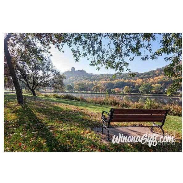 Iconic Winona, Minnesota, scene showcasing Sugarloaf rocky pinnacle in the fall, with an inviting park bench in the fore ground