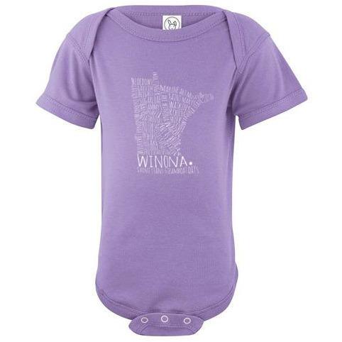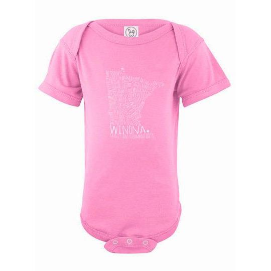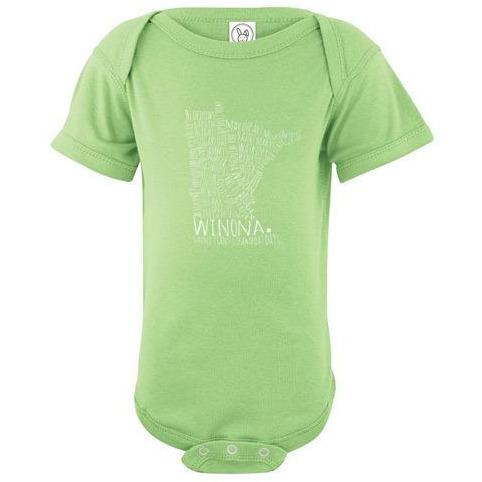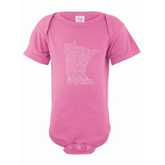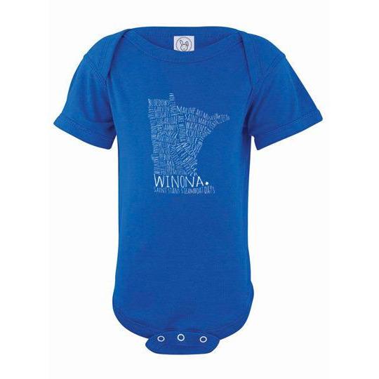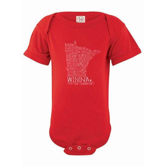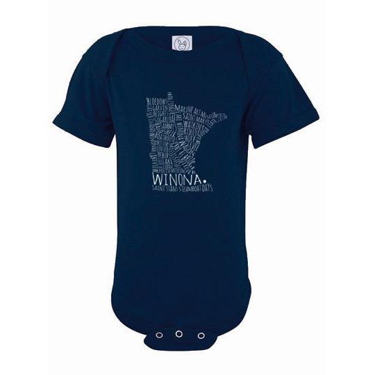 Is there a little one in your life who could use a cute Winona Minnesota onesie? This Winona Minnesota baby onesie comes in so many colors, there's something for every baby's (and mom's and dad's) fancy! Typography design features dozens of Winona landmarks such as the Wagon Bridge, Mississippi River, St. Stan's, plus much more.