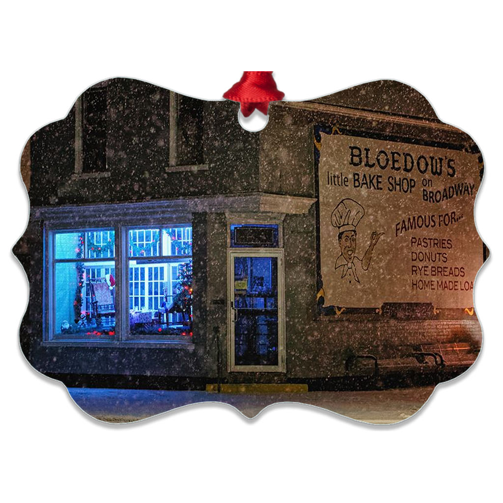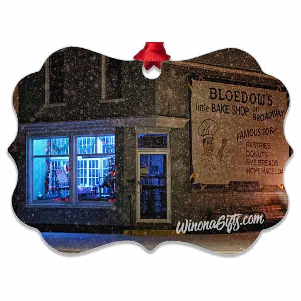 Smooth aluminum ornament is double-sided and features a favorite Winona bakery scene on both sides of ornament. Dimensions are approximately 4" x 3". Wipe clean with non-abrasive cleaning pad and mild soap or surface cleaner as needed. Hanging ribbon included.