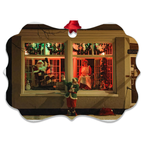 mooth aluminum ornament is double-sided and features a charming Christmas scene in Winona, Minnesota. Dimensions are approximately 4" x 3". Wipe clean with non-abrasive cleaning pad and mild soap or surface cleaner as needed. Hanging ribbon included.