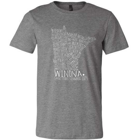 The Winona MN shirt that you love, now available in additional colors!Stylish, somewhat fitted t-shirt. Made from light, high quality cotton. Runs slightly longer than regular shirts. 4.2 oz, 100% combed ring-spun cotton jersey. Athletic Heather is 90% cotton, 10% polyester. Dark Grey Heather is 52% combed and ringspun cotton, 48% polyester Ash is 99% combed and ringspun cotton, 1% polyester.