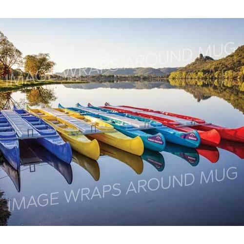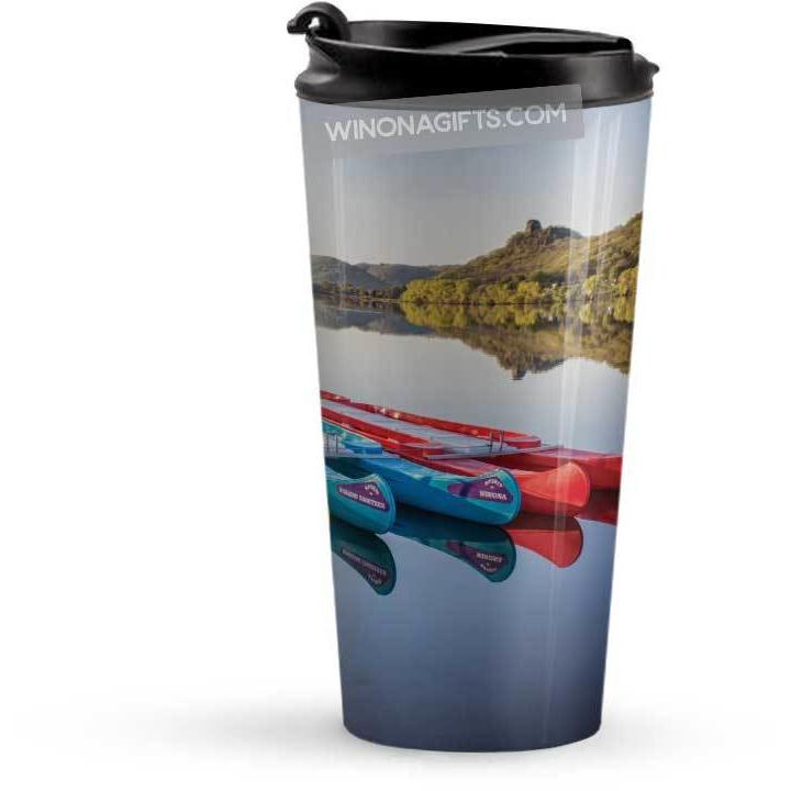 This 15 ounce stainless steel mug with screw-on lid will keep all your favorite drinks within easy reach. The mug features a spring scene at East Lake Winona with colorful canoes and Sugarloaf.