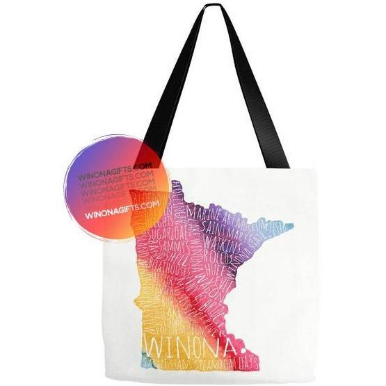 Soft and sturdy 16" x 16" Winona Minnesota tote bag is great for library books, craft materials, and more. Dry clean or spot clean only.