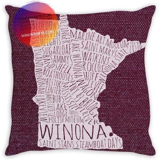 14" x 14" pillow with stuffing, sewn shut. Rear of pillow matches the front but does not have map graphic (background texture only). Note that the fabric is smooth; the burlap-like texture is visual only.